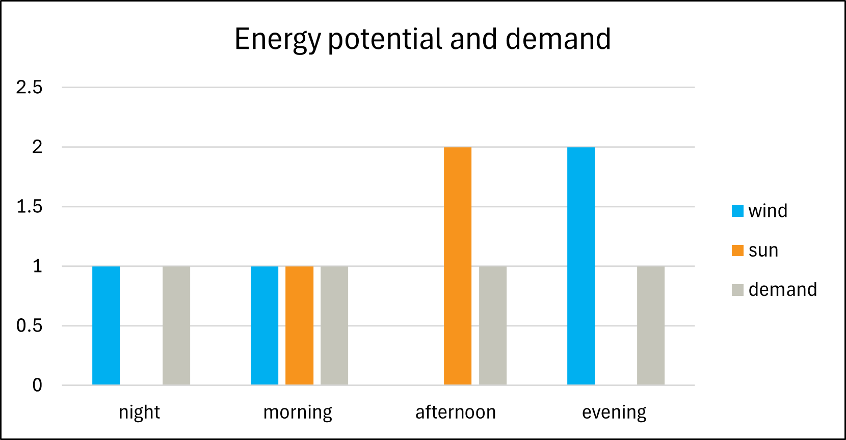 The demand (1+1+1+1) can be met with one unit of wind turbines (delivering 1+1+0+2), but only if a battery with a capacity of 1 unit is included to bridge the calm afternoon (see graph above). The battery is full at midnight. It is not needed in the night and morning, but is used fully in the afternoon, when there is no wind.