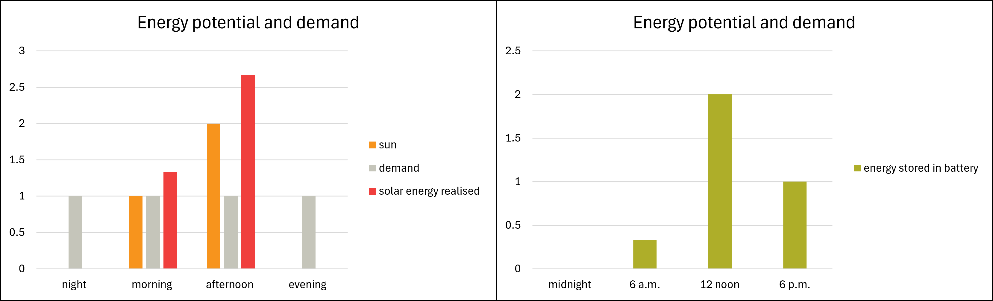 With solar cells only, the demand can be met with 4/3 units of solar cells. In that case, a battery with capacity 2 is needed to bridge the dark evening and night. The battery (now twice as big!) is half full at midnight, is emptied during the night and charged in the morning and afternoon. At the end of the evening, it is again half full.